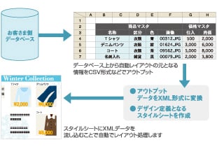 カタログやマニュアル、約款、物件情報、商品情報などの印刷物を、お客様のデータベースから完全自動化で紙面作成する自動レイアウトサービスです。